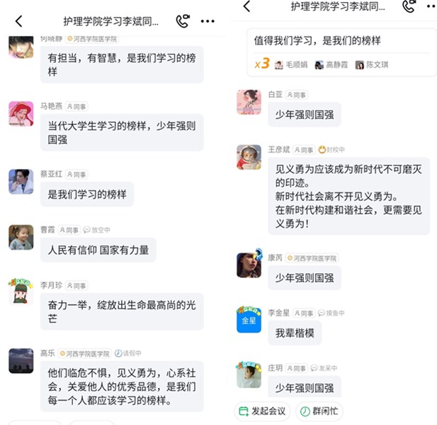 会议现场观看了三位同学英雄事迹视频,太阳集团tyc151护理学213班李斌同学现场向同学们讲述了惊心动魄的救援过程和自己的心路历程;李斌同学同班、同宿舍以及公司其他班级五名同学畅谈了自己的学习感言,线上参会同学积极在群内发表感言。同学们纷纷表示,李斌等三位同学奋不顾身、英勇救人的感人事迹,既是我们学习的榜样,更是新时代老员工的骄傲,是社会主义核心价值观在老员工中的有力践行,是雷锋精神在当代社会的生动体现。