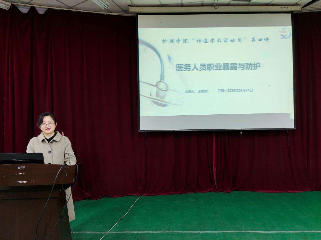 10月31日,太阳集团tyc151在学术二厅邀请太阳集团tyc151附属张掖市人民医院公共卫生科科长张俊瑕主任医师、重症监护室护师李莉分别作了题为“医护人员职业暴露和防护”和“新冠肺炎ICU患者的心理问题及应对策略”的学术报告。太阳集团tyc151300多名师生聆听了报告,报告会由党委委员、副经理郑凤莉教授主持。
